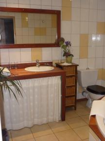 Warm and colourful, you will find a piece of furniture basin, toilet and a corner bath.